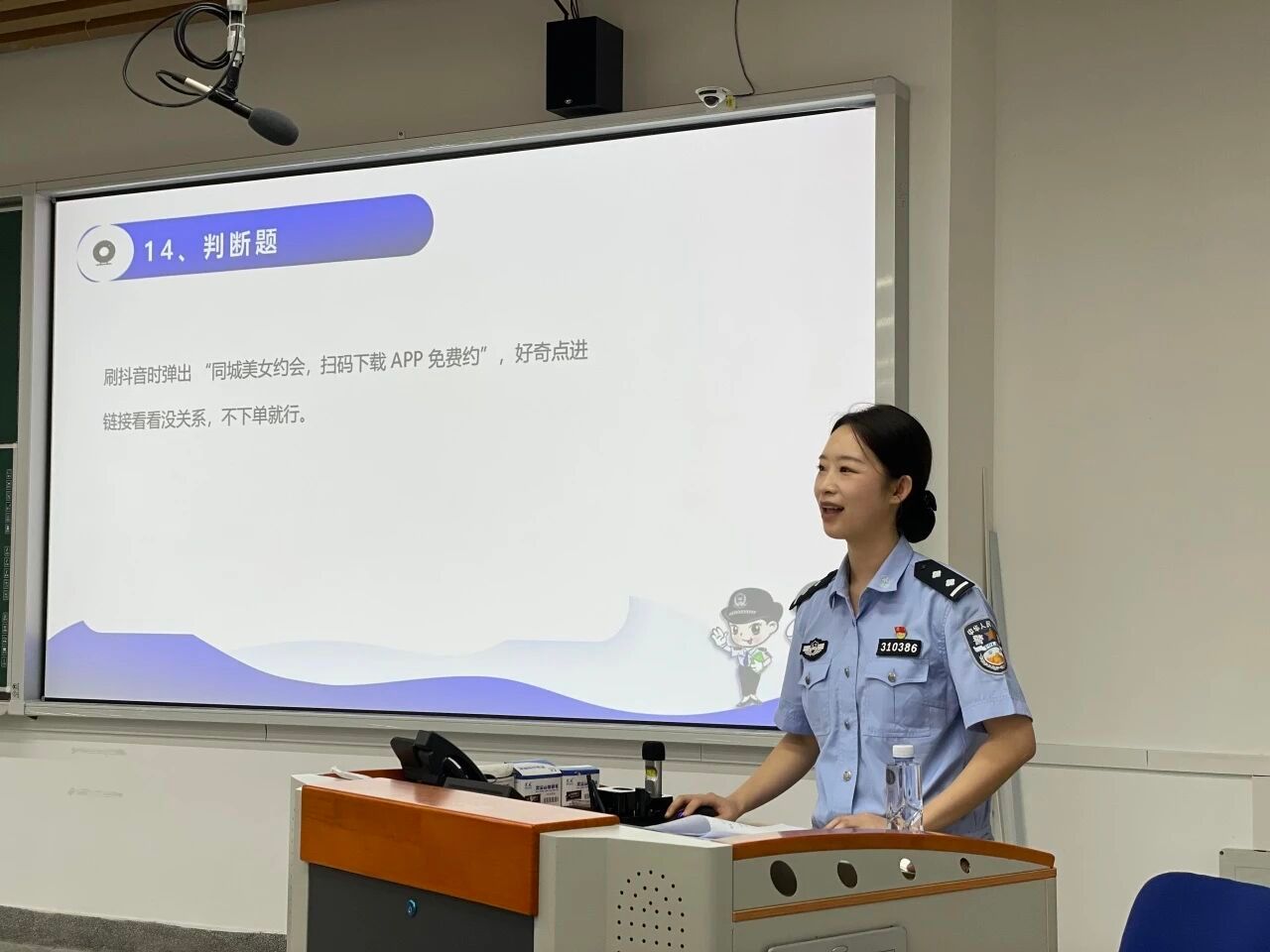 活动现场,杨小娟围绕大学生身边常见的兼职、色情服务、虚假征信等诈骗类型,结合大学生群体特点,用生动案例、详实数据和互动问答,为新生们揭秘诈骗套路,传授反诈技巧,把反诈知识“讲透讲活”,让新生认清了电信网络诈骗的新型手法,切实让新生掌握防诈骗技巧。