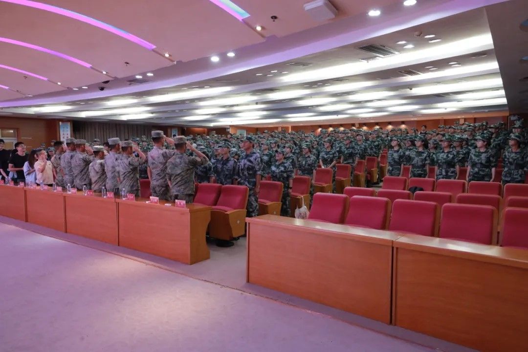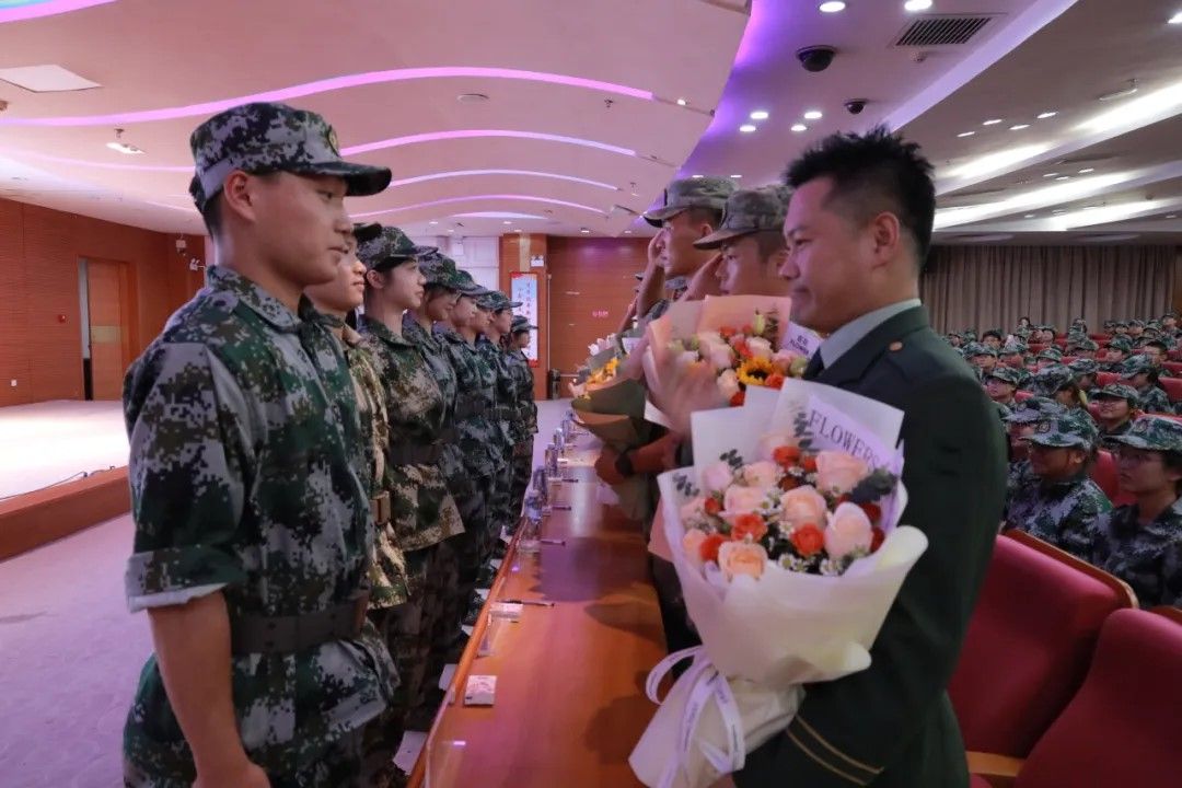 在教官未曾预料的时刻,全场响起整齐而洪亮的声音:“教官辛苦了,愿教官万事如意,工作顺利!”……一句句的祝福凝聚着25级新生对教官数日来辛勤付出的感恩,也让现场氛围在庄重之外更添温情。