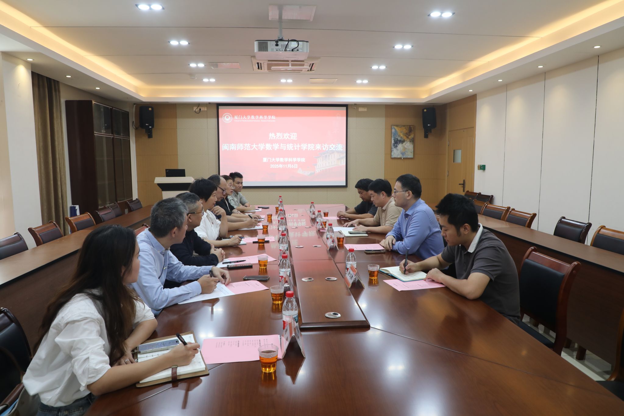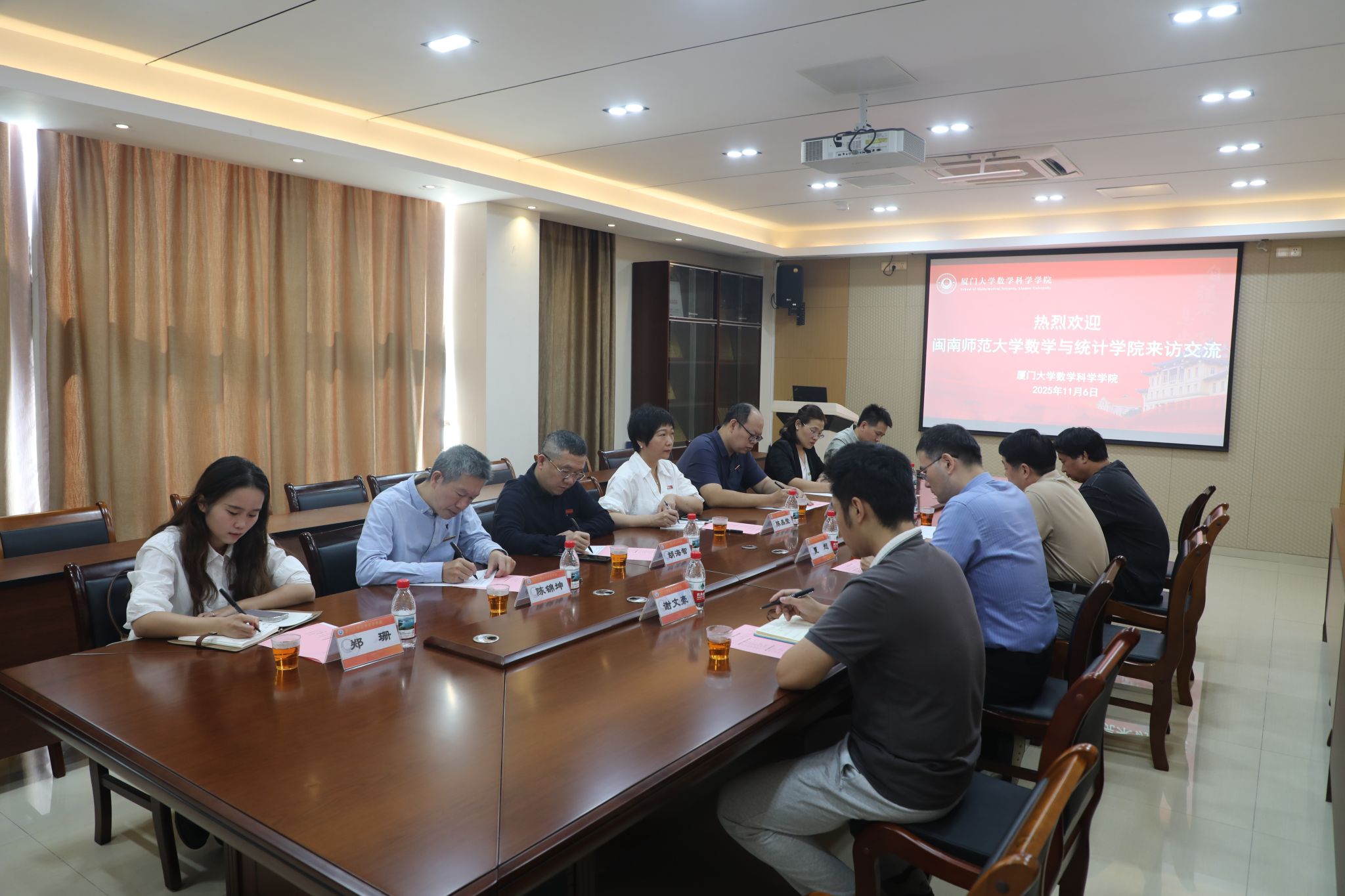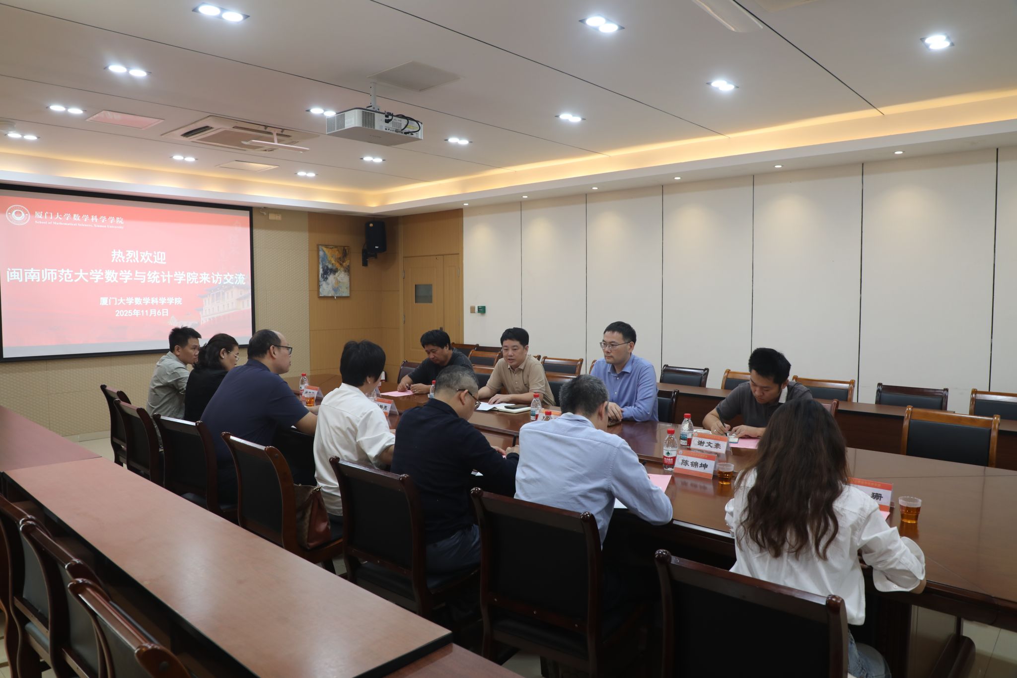 2025年11月6日上午,闽南师范大学数学与统计学院党委书记陈晶莹、院长黄韩亮带队,学院领导班子成员及相关负责人一行6人,专程赴厦门大学数学科学学院开展调研交流。厦门大学数学科学学院党委书记张清榕、院长夏超、党委副书记毛通双及学院相关职能部门负责人热情接待并出席座谈。