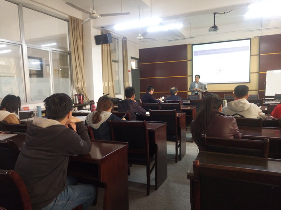 在报告中,张荣茂教授首先介绍结构变化时间序列,列举了一些如房价、股票、降雨量等有代表性的序列;其次介绍用时空序列建立相关的统计量,观察数据的平稳性,找到空间变点,并用非参估计方法确定找到的空间变点是否正确;最后用物理量(如空间距离)来刻画空间数据结构,确立数据影像,使用分割方法把每个方格的变点都找出来,然后用线连接起来,找到影像边界。报告结束后,在座的老师和学生就相关研究问题进行了探讨和交流。
