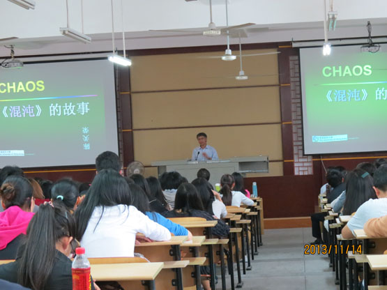 应我院邀请,11月14日下午三点半,香港城市大学陈关荣教授在砺志楼120教室作了一场题为《混沌的故事》的学术报告,报告会上,陈教授主要介绍了“现代混沌和严格混沌数学理论的诞生”、“离散混沌的概念和数学理论的诞生”、“混沌的映射特性及其应用”等内容。