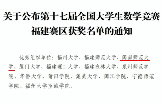 近日,第十七届全国大学生数学竞赛福建赛区初赛结果揭晓。我校学子表现优异,共斩获多项奖项,并有四名同学成功晋级全国决赛。同时,学校再次获评福建省“优秀组织单位”,充分体现了我院在数学学科人才培养和竞赛组织方面的扎实工作与持续进步。